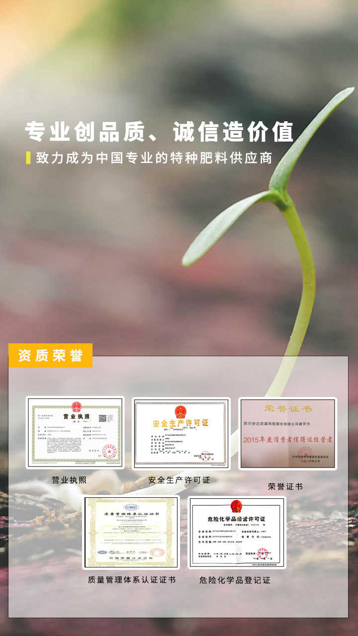 經(jīng)過二十余年的探索和實(shí)踐,依托自身技術(shù)和出口背景,按照國際市場規(guī)范培養(yǎng)了大批高素質(zhì)的專業(yè)化技術(shù)化團(tuán)隊(duì),掌握了水溶性肥料的核心技術(shù),擁有完善的研發(fā)中心、質(zhì)檢中心,目前已獲得多個(gè)國家專利技術(shù)。公司一直把“做中國專業(yè)的特種肥料供應(yīng)商”作為自身的發(fā)展使命。推廣高端植物營養(yǎng)與先進(jìn)技術(shù),高效施肥方式的綜合配套方案,減輕中國種植業(yè)勞動強(qiáng)度,讓種植業(yè)效率更高、效果更強(qiáng)、效益更好!努力成為革新中國種植業(yè)生產(chǎn)方式的偉大公司!